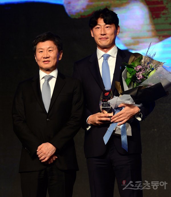 K리그 2 감독상을 수상한 아산 박동혁 감독이 정몽규 회장과 기념촬영을 하고 있다.