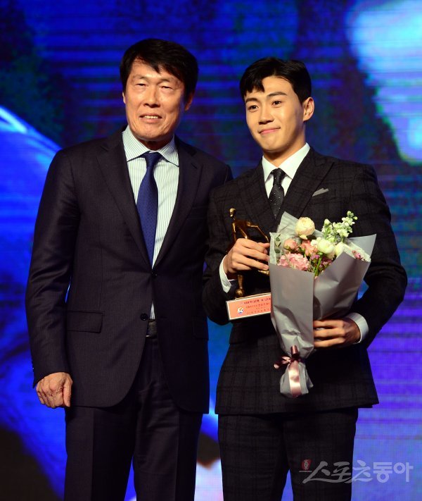 3일 서울 홍은동 그랜드힐튼호텔에서 ‘KEB하나은행 K리그 대상 2018’ 시상식이 열렸다. K리그 1 영플레이어상을 수상한 울산 한승규가 차범근 전 감독과 기념촬영을 하고 있다. 김민성 기자 marineboy@donga.com