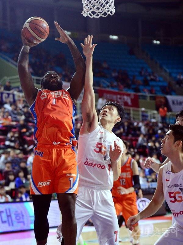 6일 인천 삼산월드체육관에서 열린 ‘2018-2019 SKT 5GX 프로농구’ 인천 전자랜드와 서울 SK의 경기에서 전자랜드 팟츠가 SK 변기훈의 수비를 피해 슛을 쏘고 있다.