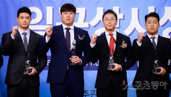 7일 서울 강남구 청담동에 위치한 호텔리베라에서 ‘2018 유디아 글로벌 일구상’ 시상식이 열렸다. 시상식이 끝난 후 각 부문 수상자들이 기념촬영을 하고 있다. 왼쪽부터 두산 김재환, LA다저스 류현진, 한화 정우람, kt 강백호.