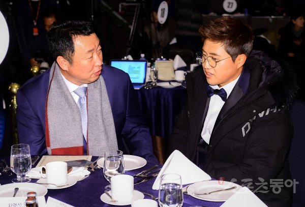 7일 서울 강남구 청담동에 위치한 호텔리베라에서 ‘2018 유디아 글로벌 일구상’ 시상식이 열렸다. LG 차명석 단장과 채은성(오른쪽)이 대화를 나누고 있다.