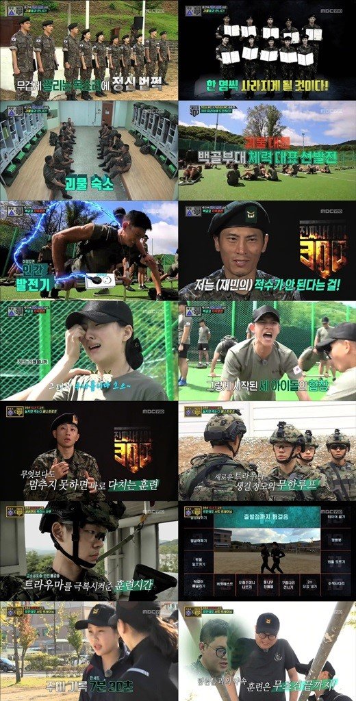 7일 밤 9시 55분 방송된 MBC \'진짜사나이300\'(연출 최민근 장승민)에는 \'백골부대 신병교육대\' 교육을 마치고 \'불사조 수색대대\' 명예 하사로 임명된 10인과 특전사에 입소한 독전사 10인의 죽음의 기초 체력 훈련 모습이 담겼다.