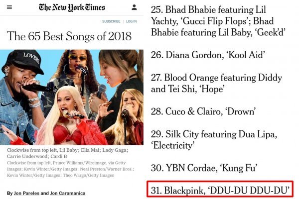 블랙핑크가 미국 ‘뉴욕 타임즈’가 선정한 ‘The 65 Best Songs of 2018’ 명단에 이름을 올렸다.