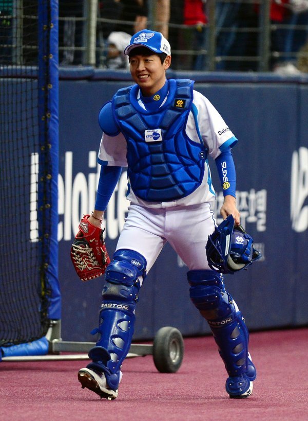 9일 서울 고척스카이돔에서 ‘2018 희망더하기 자선야구대회’가 열렸다. 정수빈이 양신팀의 포수로 나서 환한 미소를 짓고 있다.