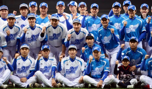 9일 서울 고척스카이돔에서 ‘2018 희망더하기 자선야구대회’가 열렸다. 자선야구대회에 참석한 선수들이 카메라를 향해 포즈를 취하고 있다.