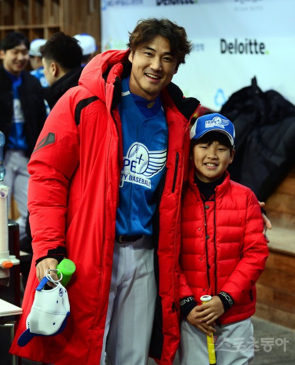 9일 서울 고척스카이돔에서 ‘2018 희망더하기 자선야구대회’가 열렸다. 종범신 코치로 참석한 홍성흔이 아들 홍화철과 함께 기념촬영을 하고 있다.
