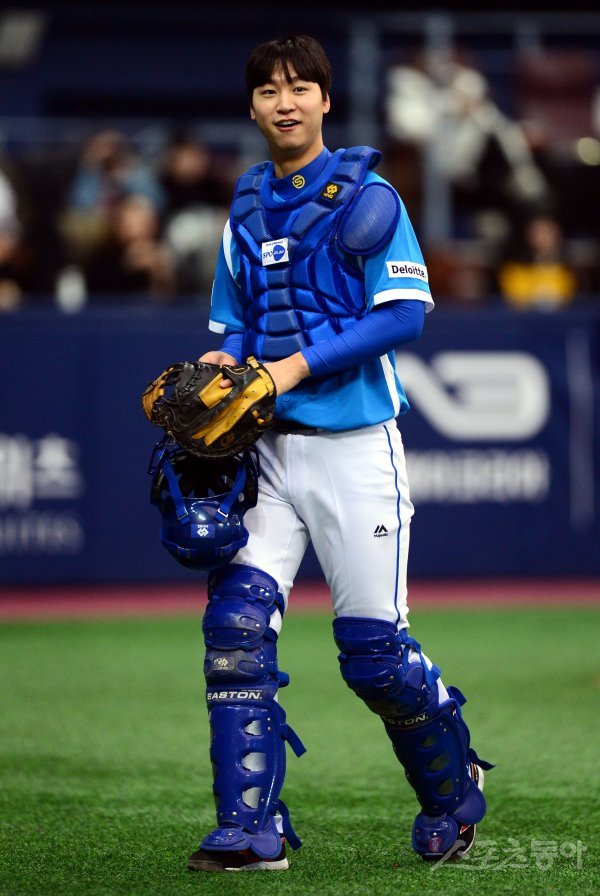 9일 서울 고척스카이돔에서 ‘2018 희망더하기 자선야구대회’가 열렸다. 종범신 포수로 나선 엄상백이 환한 미소를 짓고 있다. 고척 | 김민성 기자 marineboy@donga.com