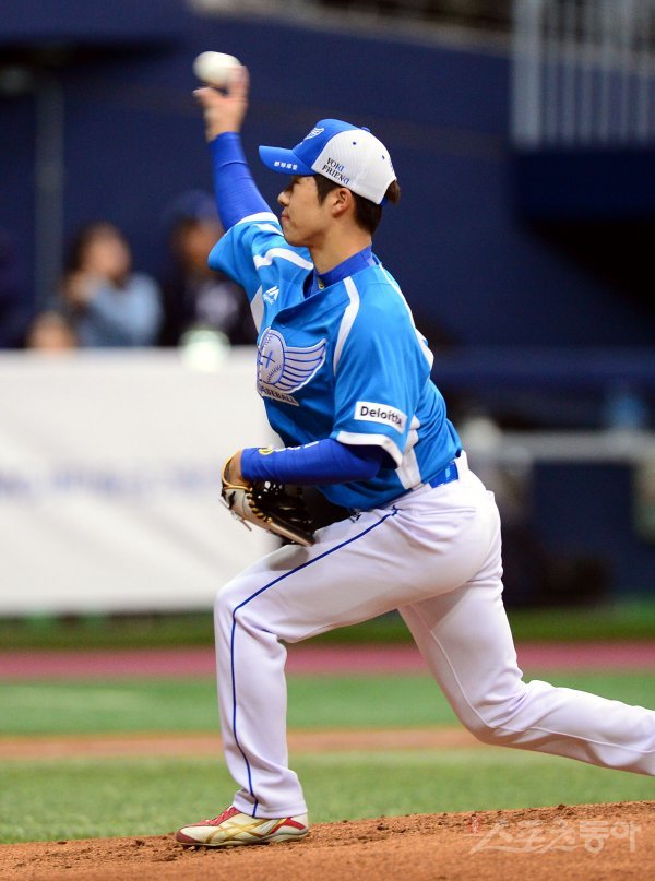 9일 서울 고척스카이돔에서 ‘2018 희망더하기 자선야구대회’가 열렸다. 종범신 선발투수로 나선 조수행이 힘차게 볼을 던지고 있다.