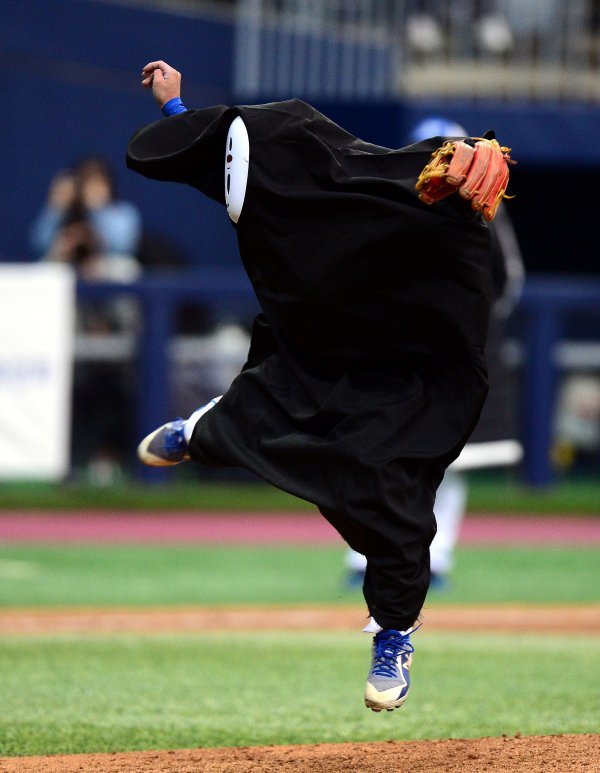 9일 서울 고척스카이돔에서 ‘2018 희망더하기 자선야구대회’가 열렸다. 5회말 무사에서 가오나시 분장으로 마운드에 오른 종범신팀 김민수가 투구를 펼치고 있다.
