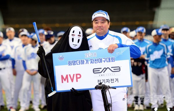 9일 서울 고척스카이돔에서 ‘2018 희망더하기 자선야구대회’가 열렸다. 종범신팀이 양신팀에 6-3으로 승리한 뒤 MVP를 수상한 김민수가 양준혁과 기념촬영을 하고 있다.