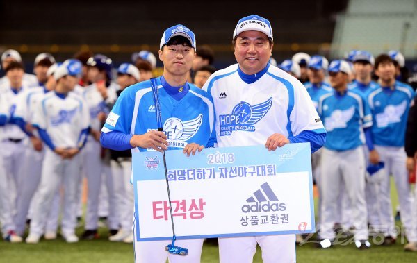 9일 서울 고척스카이돔에서 ‘2018 희망더하기 자선야구대회’가 열렸다. 종범신팀이 양신팀에 6-3으로 승리한 뒤 타격상을 수상한 구승민이 양준혁과 기념촬영을 하고 있다.