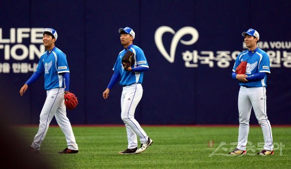 9일 서울 고척스카이돔에서 ‘2018 희망더하기 자선야구대회’가 열렸다. 6회말 2사 1, 2루에서 양신팀 류지혁 타석 때 종범신팀 외야수 박상원, 구승민, 김성욱이 수비 시프트를 펼치고 있다.