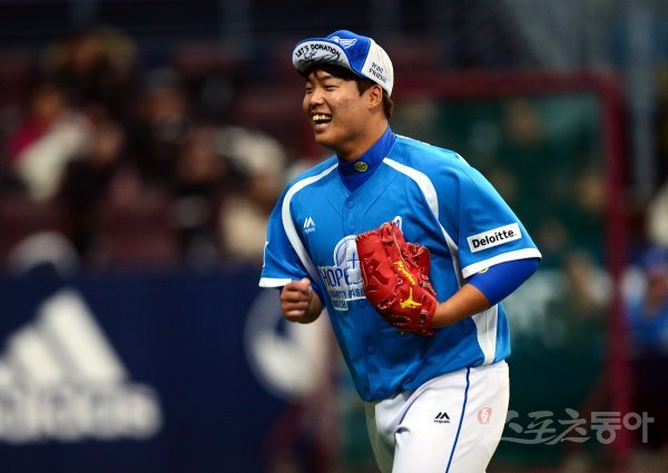 9일 서울 고척스카이돔에서 ‘2018 희망더하기 자선야구대회’가 열렸다. 6회말 2사 만루에서 양신팀 심규빈을 아웃시킨 종범신팀 강백호가 환한 미소를 짓고 있다.