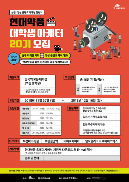 현대약품은 오는 16일까지 콘텐츠 마케팅을 직접 경험할 수 있는 대학생마케터 20기를 모집한다. 서류-면접 전형을 통해 기획 파트와 영상 파트로 나눠 총 16명을 선발한다. 대학생마케터는 약 두 달간 현대약품의 복합마이녹실, 루핑점안액, 미에로화이바, 헬씨올리고프로바이오틱스 등의 제품으로 콘텐츠 제작 및 홍보 활동을 진행한다. 또한 대학생마케터들의 역량 강화를 위한 실무진 특강과 디지털마케팅 전문회사 후크바이럴 이진호 대표의 콘텐츠 기획력과 바이럴 노하우에 대한 특강도 받는다. 우수한 성과를 올린 대학생마케터 팀에게는 상금이 수여될 예정이다.