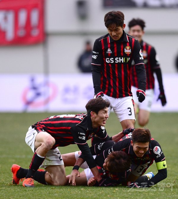 9일 서울월드컵경기장에서 열린 프로축구 ‘2018 KEB 하나은행 K리그1(클래식)’ 승강 플레이오프 2차전 부산아이파크와 서울FC 경기에서 후반 종료 직전 서울 박주영이 동점골을 성공시킨 후 동료들과 기뻐하고 있다.