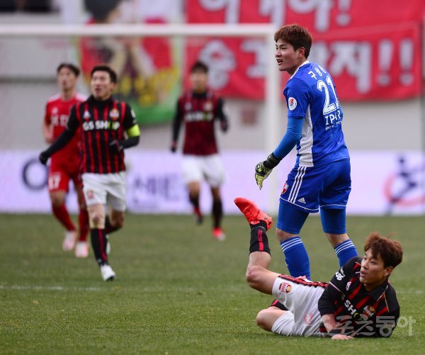 9일 서울월드컵경기장에서 열린 프로축구 ‘2018 KEB 하나은행 K리그1(클래식)’ 승강 플레이오프 2차전 부산아이파크와 서울FC 경기에서 부산 구상민이 서울 박주영에게 중거리 슛팅을 허용한 후 골대를 바라보고 있다.