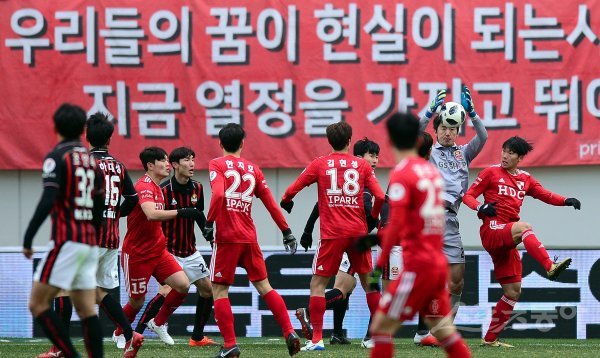 9일 서울월드컵경기장에서 열린 프로축구 ‘2018 KEB 하나은행 K리그1(클래식)’ 승강 플레이오프 2차전 부산아이파크와 서울FC 경기에서 서울 양한빈이 부산 선수들 사이에서 볼을 잡고 있다.