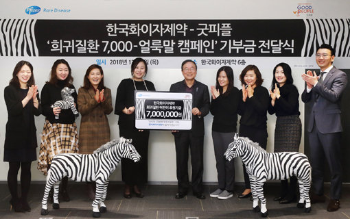 한국화이자제약은 희귀질환 환자들을 응원하는 ‘희귀질환 7000-얼룩말 캠페인’ 기부금 700만 원을 지난 6일 국제구호개발 NGO 굿피플에 전달했다. 지난 5월 희귀질환 극복의 날부터 약 7개월간 진행된 캠페인을 통해 희귀질환 환자를 응원하는 메시지가 모일 때마다 소정의 금액을 적립하는 방식으로 모금됐으며 국내 희귀질환 환아들을 위해 쓰여질 예정이다. 희귀질환은 약 80%가 유전질환이며, 전 세계 7000여 개의 희귀질환 중 적절한 치료법이 개발된 질환은 전체 중 약 5%에 불과하다.