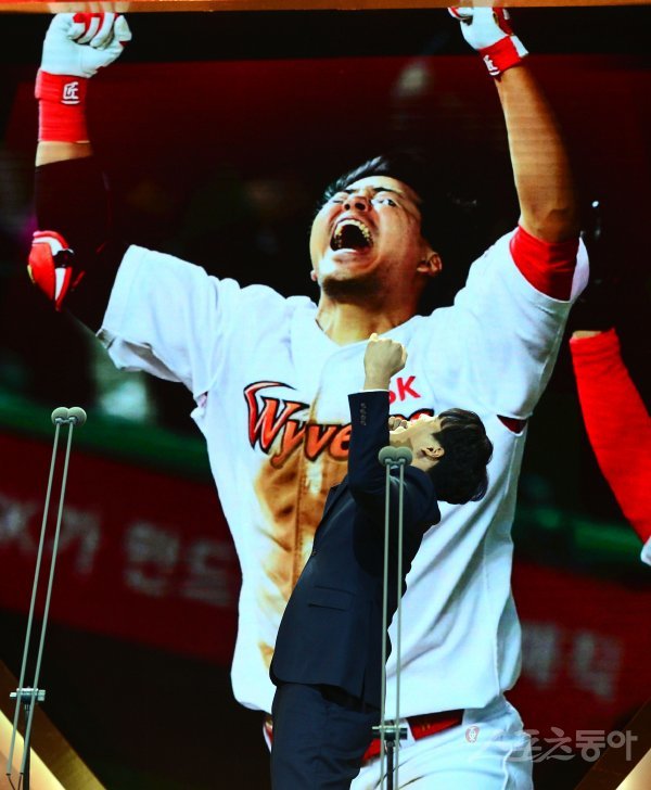 10일 서울 코엑스에서 열린 ‘2018 골든글러브 시상식’에 참석한 SK 한동민이 골든포토상을 수상한 뒤 포즈를 따라하고 있다.