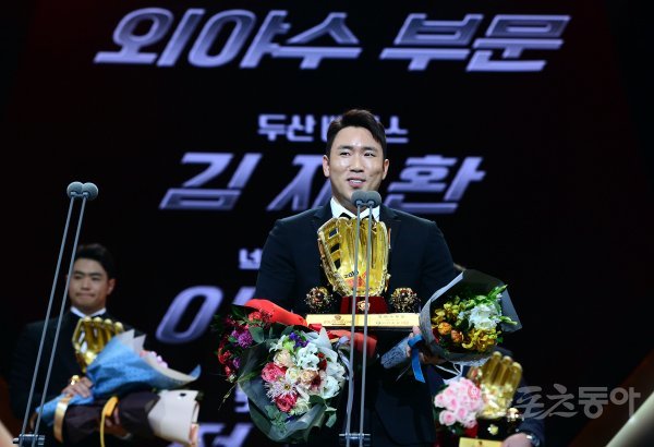 10일 서울 코엑스에서 열린 ‘2018 골든글러브 시상식’에 참석한 롯데 전준우가 외야수 부문 골든글러브를 수상한 뒤 소감을 밝히고 있다.