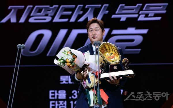 10일 서울 코엑스에서 열린 ‘2018 골든글러브 시상식’에 참석한 롯데 이대호가 지명타자 부문 골든글러브를 수상한 뒤 소감을 밝히고 있다.