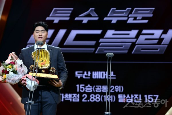 10일 서울 코엑스에서 열린 ‘2018 골든글러브 시상식’에 참석한 두산 이영하가 투수 부문 골든글러브를 린드블럼 대리수상한 뒤 소감을 밝히고 있다.