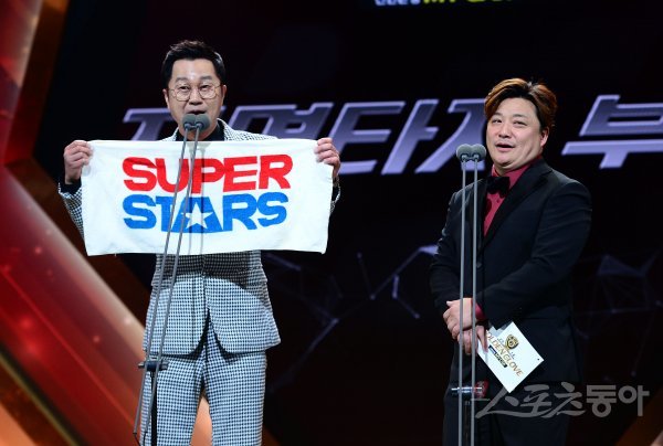 10일 서울 코엑스에서 열린 ‘2018 골든글러브 시상식’에 참석한 지상렬과 윤정수가 시상자로 나서고 있다.