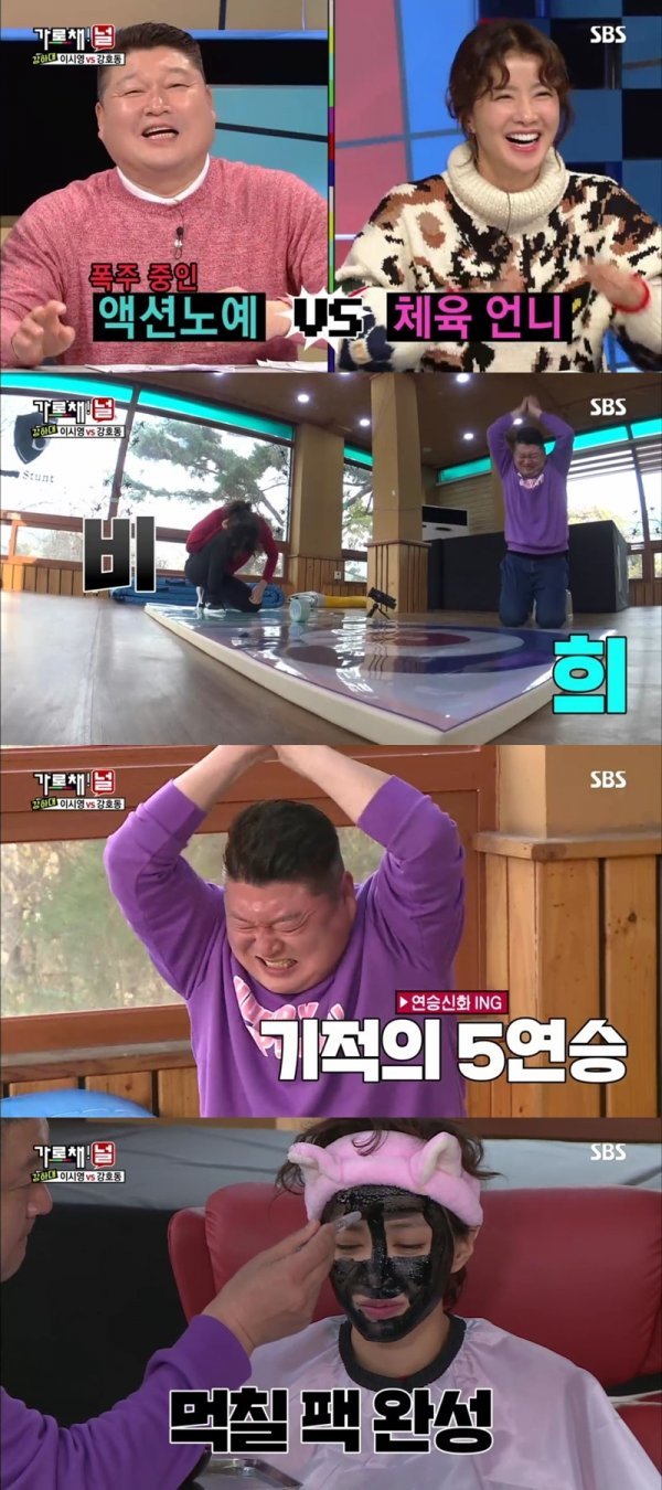 이시영이 선공에 나선 가운데 긴장감은 극에 달했다. 이시영은 신중하게 청테이프를 굴렸지만, 테이프는 원 안에 안착하지 못하고 5cm를 기록했다. 강호동은 아슬아슬하게 원 안에 청테이프를 굴려 승리를 쟁취, 5연승을 기록했다. 강호동은 "실격패 당하는 줄 알았다, 다시 봐도 짜릿하다"라면서 "승부의 신이 잡아줬다"고 기뻐했다. 대결에서 진 이시영은 ‘얼탁’(얼굴 탁본)을 위해 오징어 먹물을 얼굴에 칠하게 됐다. 이시영은 먹물 냄새에 “상한 것 아니냐”고 했던 것도 잠시, ‘얼탁’ 후 "리프팅 효과가 있는 것 같다"고 긍정적인 면모를 보여 웃음을 자아냈다.