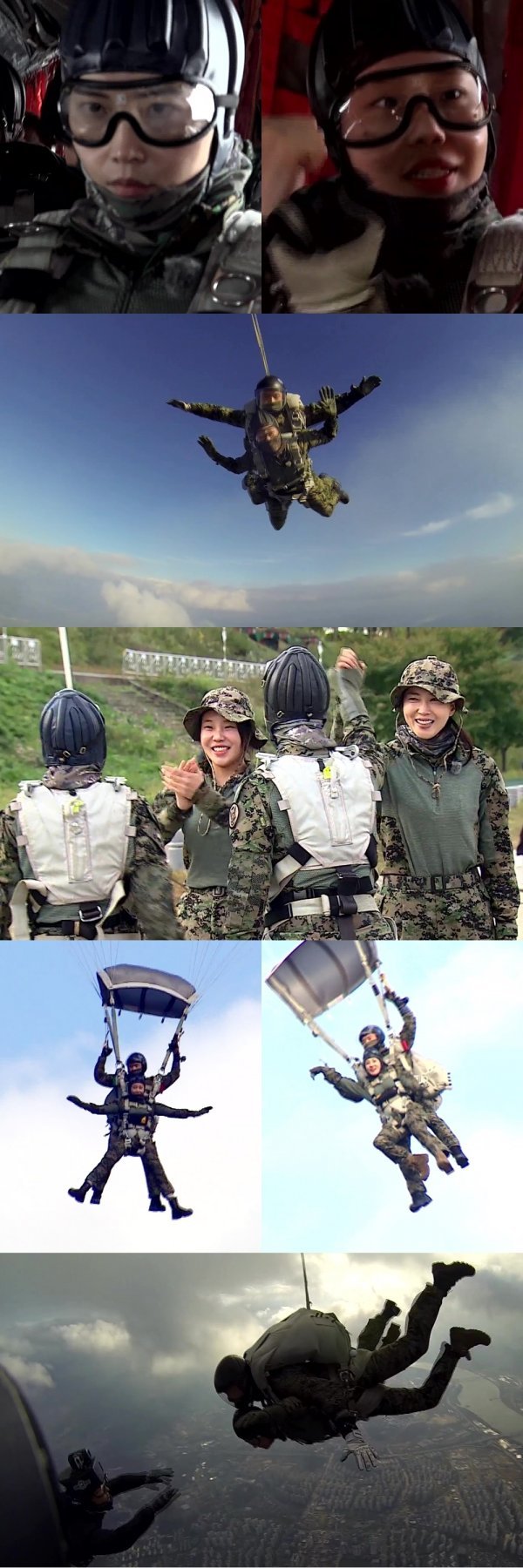 이와 관련 '진짜사나이300' 측은 14일 특전사 5중대 오윤아, 김재화, 산다라박, 주이가 2,700미터 상공 실전 '텐덤 강하' 훈련 스틸을 공개했다.