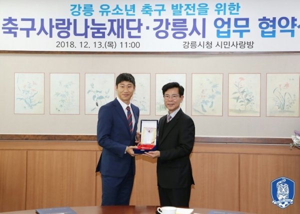 축구사랑나눔재단은 13일(목) 오전 11시 강릉시청에서 유소년축구발전을 위한 업무 협약을 체결했다. 협약식에는 김한근 강릉시장, 박용수 축구사랑나눔재단 사무국장, 이근호 재단 홍보대사가 참여했다.