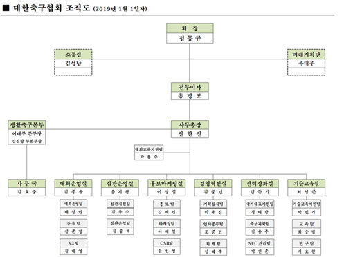 대한축구협회가 14일 조직 개편을 발표했다. 대표팀의 경쟁력 강화와 유소년 육성을 위해 기술 부문을 강화했다. 조직개편은 내년 1월1일부터 시행된다.