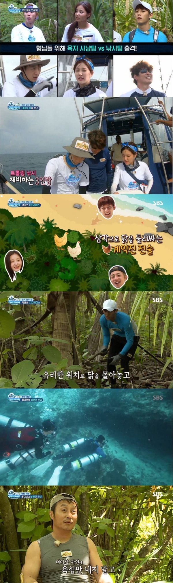 막내 3인방 민혁, 연우, 준은 육고기 사냥에 도전했다. 세 사람은 모두 남다른 운동신경을 자랑하며 자신감을 드러냈다. 이후 숲속에서 닭을 발견한 이들은 닭을 쫓아 이리저리 뛰어다녔다. 하지만 야생 닭의 엄청난 속도에 결국 닭 사냥에는 실패했다. 민혁은 “누가 닭이 못난다고 했어. 봉황인 줄 알았다”며 허탈해했다.
