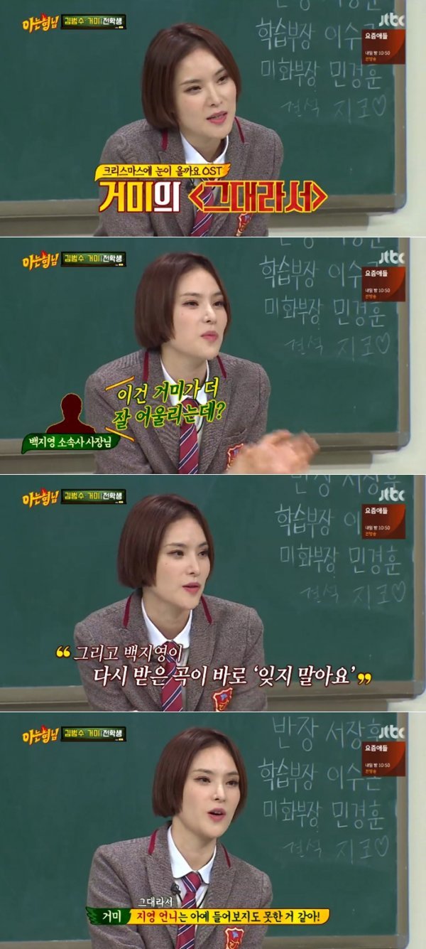거미는 “원래 백지영 언니가 ‘아이리스’ OST로 부르기로 했다. 내가 가이드 보컬을 했는데 언니네 회사에서 ‘이건 거미에게 더 잘 어울린다’고 했고 내가 부르게 됐다”며 “이후 언니가 새로 만들어서 부른 곡이 ‘잊지 말아요’”라고 설명했다. 그는 ‘그대라서’를 짧게 불렀고 서장훈은 “내가 제일 좋아하는 노래”라고 감탄했다.