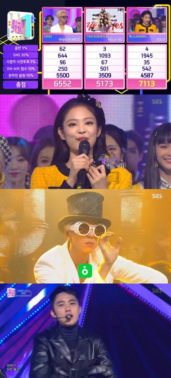 가수 제니가 ‘인기가요’ 1위를 차지했다.