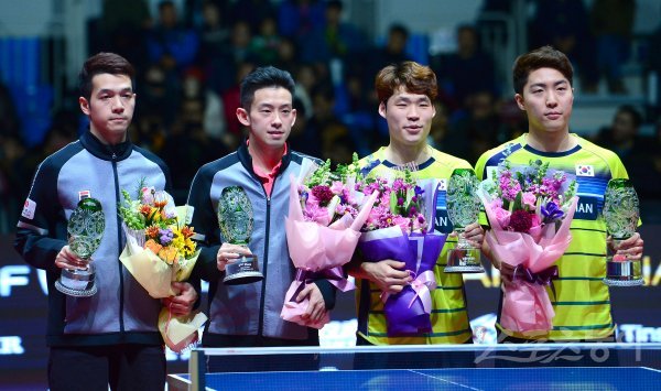 16일 인천 남동체육관에서 열린 2018 국제탁구연맹(ITTF) 월드투어 그랜드파이널 남자 복식 결승에서 한국 장우진-임종훈 조가 홍콩 웡춘팅-호콴팃 조를 상대로 세트스코어 3대2(10-12, 13-11, 11-8, 10-12, 11-8) 승리를 거두며 우승을 차지한 후 기념촬영을 하고 있다.
