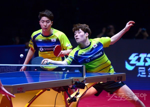 16일 인천 남동체육관에서 열린 2018 국제탁구연맹(ITTF) 월드투어 그랜드파이널 남자 복식 결승에서 한국 장우진(오른쪽)-임종훈 조가 홍콩 웡춘팅-호콴팃 조를 상대로 스매싱 공격을 하고 있다.