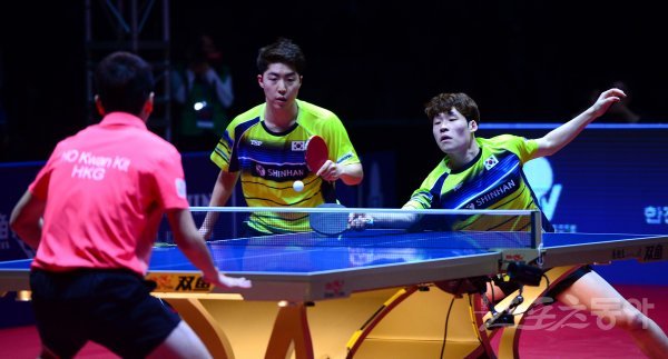 16일 인천 남동체육관에서 열린 2018 국제탁구연맹(ITTF) 월드투어 그랜드파이널 남자 복식 결승에서 한국 장우진(오른쪽)-임종훈 조가 홍콩 웡춘팅-호콴팃 조를 상대로 스매싱 공격을 하고 있다.