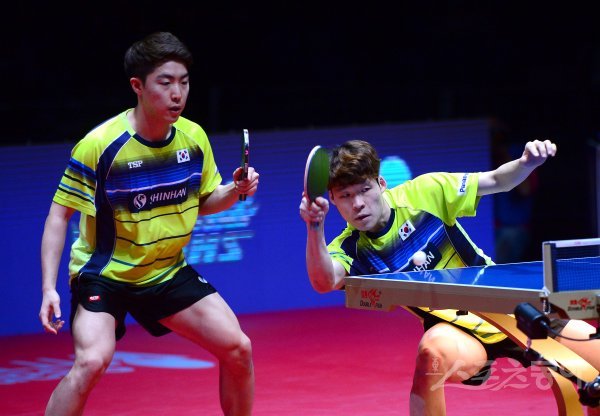16일 인천 남동체육관에서 열린 2018 국제탁구연맹(ITTF) 월드투어 그랜드파이널 남자 복식 결승에서 한국 장우진(오른쪽)-임종훈 조가 홍콩 웡춘팅-호콴팃 조를 상대로 스매싱 공격을 하고 있다.