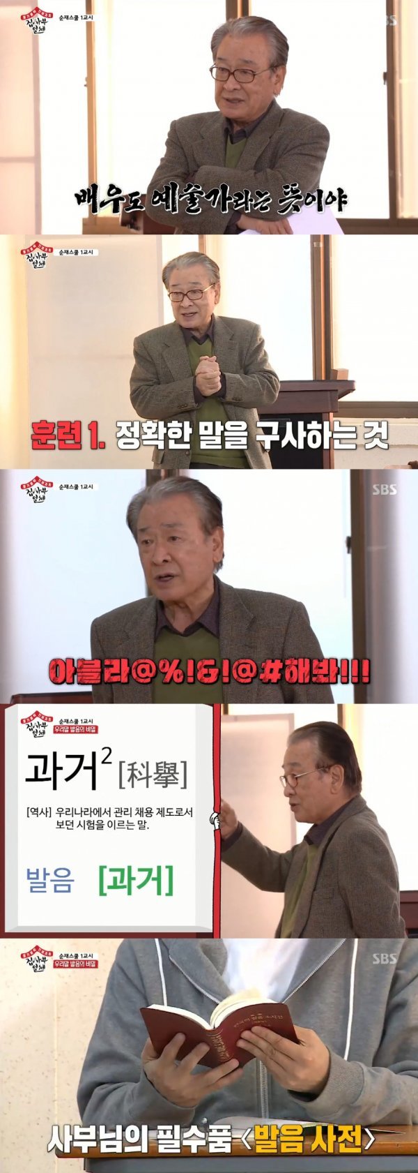또 그는 “그래서 배우는 말 훈련부터 시작을 해야 한다”며 이승기에게 문장 읽기를 시켰다. 단어의 뜻이 다를 때 장음과 단음으로 구분하는 것을 언급하기도 했다.