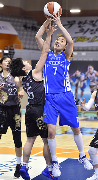우리은행 박혜진(오른쪽)이 16일 이순신체육관에서 열린 OK저축은행과 홈경기에서 인혜지를 뚫고 골밑슛을 시도하고 있다. 사진제공|WKBL