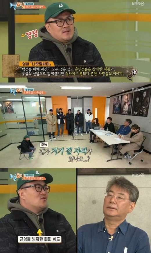 \'나랏말싸미\' 감독은 "주연 배우들은 송강호, 박해일이다"라고 말했고 데프콘은 크게 놀라며 "난 집에 가겠다"라고 당혹감을 감추지 못했다.