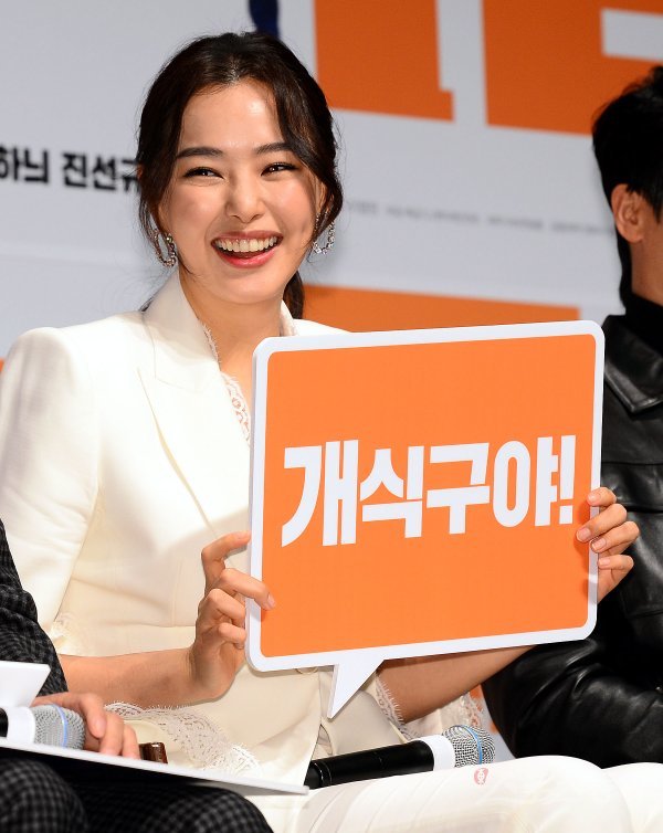 17일 서울 압구정CGV에 영화 ‘극한직업(이병헌 감독)’ 제작보고회가 열렸다. 배우 이하늬가 영화와 관련된 판넬을 들고 있다.