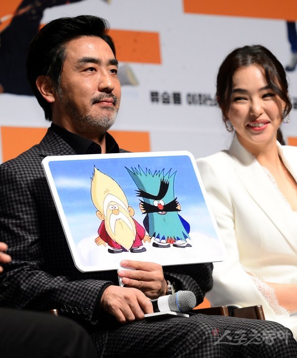 17일 서울 압구정CGV에 영화 ‘극한직업(이병헌 감독)’ 제작보고회가 열렸다. 배우 류승룡이 ‘배추도사 무우도사’ 판넬을 들고 있다.