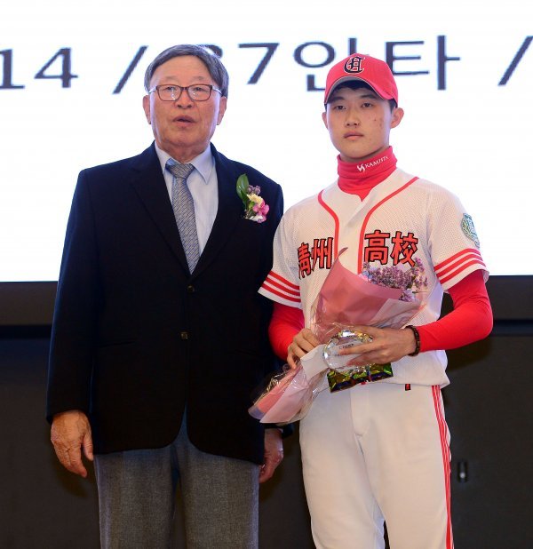 17일 서울 서초구 더케이호텔 서울 컨벤션센터에서 열린 ‘2018 야구 소프트볼인의 밤’ 시상식에서 이영민 타격상을 수상한 청주고 최정원이 김응룡 대한야구소프트볼협회 회장과 기념촬영을 하고 있다.