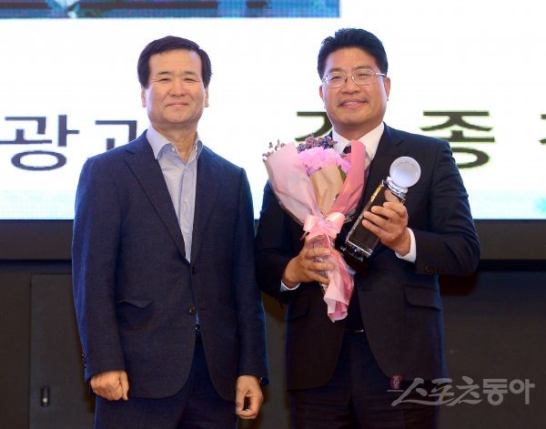 17일 서울 서초구 더케이호텔 서울 컨벤션센터에서 열린 ‘2018 야구 소프트볼인의 밤’ 시상식에서 감사패를 수상한 김종천 기장군 문화관광과 과장이 김재철 경기도야구소프트볼협회 회장과 기념촬영을 하고 있다.