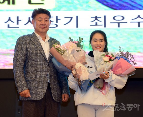 17일 서울 서초구 더케이호텔 서울 컨벤션센터에서 열린 ‘2018 야구 소프트볼인의 밤’ 시상식에서 여자야구 우수선수상을 수상한 원혜련(양구블랙펄스)이 기념촬영을 하고 있다.