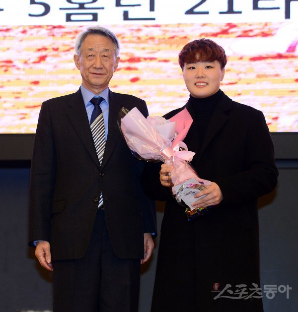17일 서울 서초구 더케이호텔 서울 컨벤션센터에서 열린 ‘2018 야구 소프트볼인의 밤’ 시상식에서 소프트볼 우수선수상(타자)을 수상한 이경민(인천시체육회)가 기념촬영을 하고 있다.