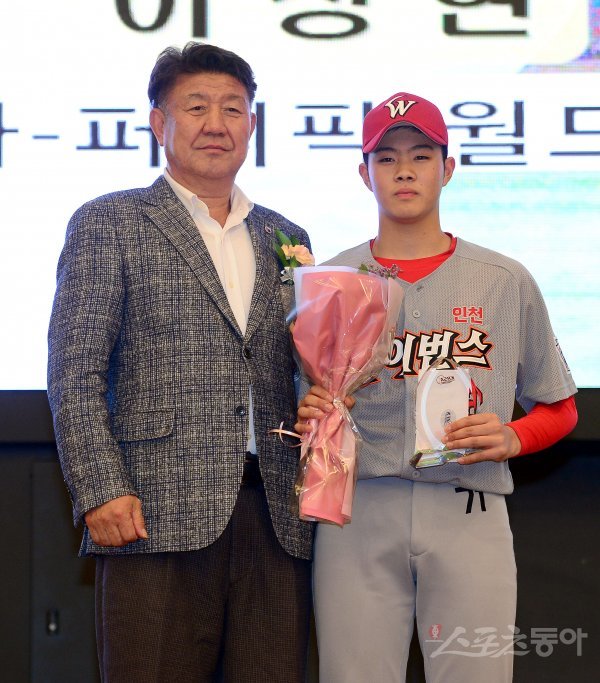 17일 서울 서초구 더케이호텔 서울 컨벤션센터에서 열린 ‘2018 야구 소프트볼인의 밤’ 시상식에서 리틀야구부 우수선수상을 수상한 이성현(와이번스 리틀야구단)이 기념촬영을 하고 있다.