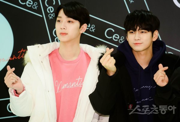 워너원의 라이관린과 옹성우(오른쪽)가 17일 서울 마포구 상암동 누리꿈스퀘어에서 열린 CJ ENM 오쇼핑의 자사 패션 브랜드 ‘씨이앤(Ce&)’에서 진행한 팬 사인회에서 포즈를 취하고 있다.