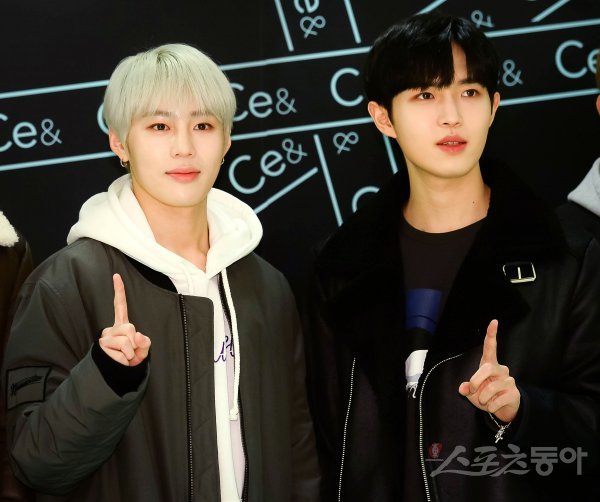 워너원의 하성운과 김재환(오른쪽)이 17일 서울 마포구 상암동 누리꿈스퀘어에서 열린 CJ ENM 오쇼핑의 자사 패션 브랜드 ‘씨이앤(Ce&)’에서 진행한 팬 사인회에서 포즈를 취하고 있다.